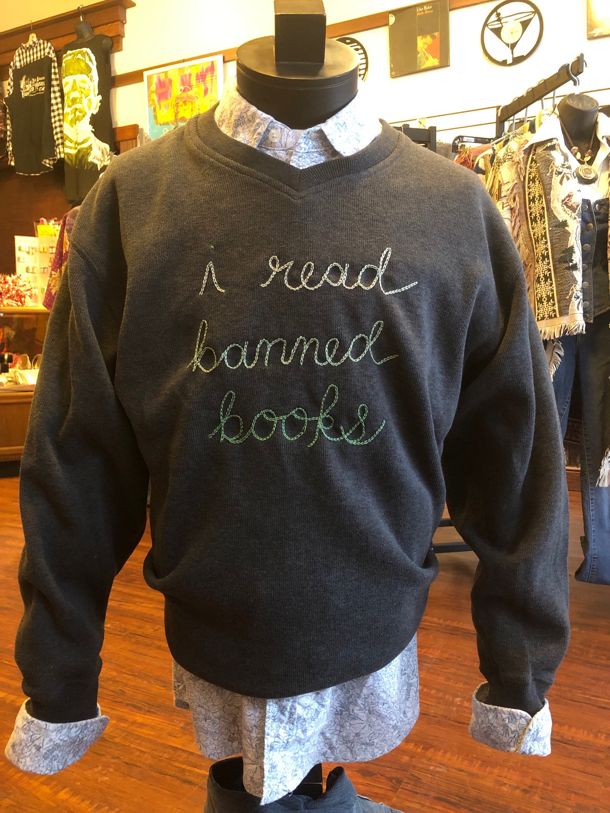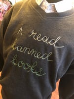 Upcycled “I Read Banned Books” hand-embroidered sweater